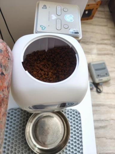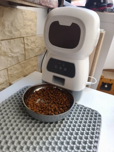I love it!! It arrived very well packaged and installs in a moment. It's compact and very nice, the quality is also good. It holds about 1 and a half kilograms of food inside. It works in small quantities and you can program the time and the number of times you want it to dispense; I've set it to dispense 6 times, twice a day for my cats. It's ideal for cats, I think it's a bit small for dogs. I recommend it. Very fast shipping and reception and careful seller. Thank you.