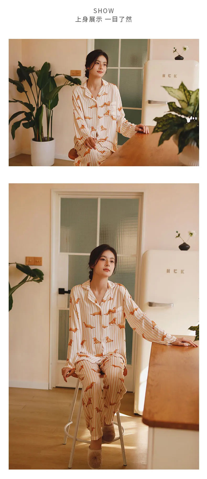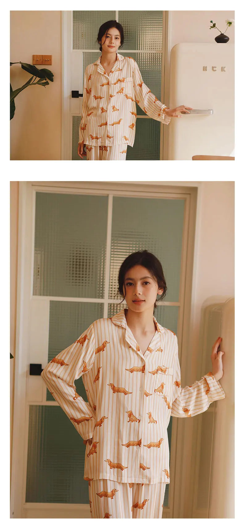 Relax in comfort and cuteness with this INS-style dachshund dog print pajama set for women. Featuring a charming dachshund pattern paired with classic stripes, this two-piece sleepwear set blends playful design with cozy elegance.
